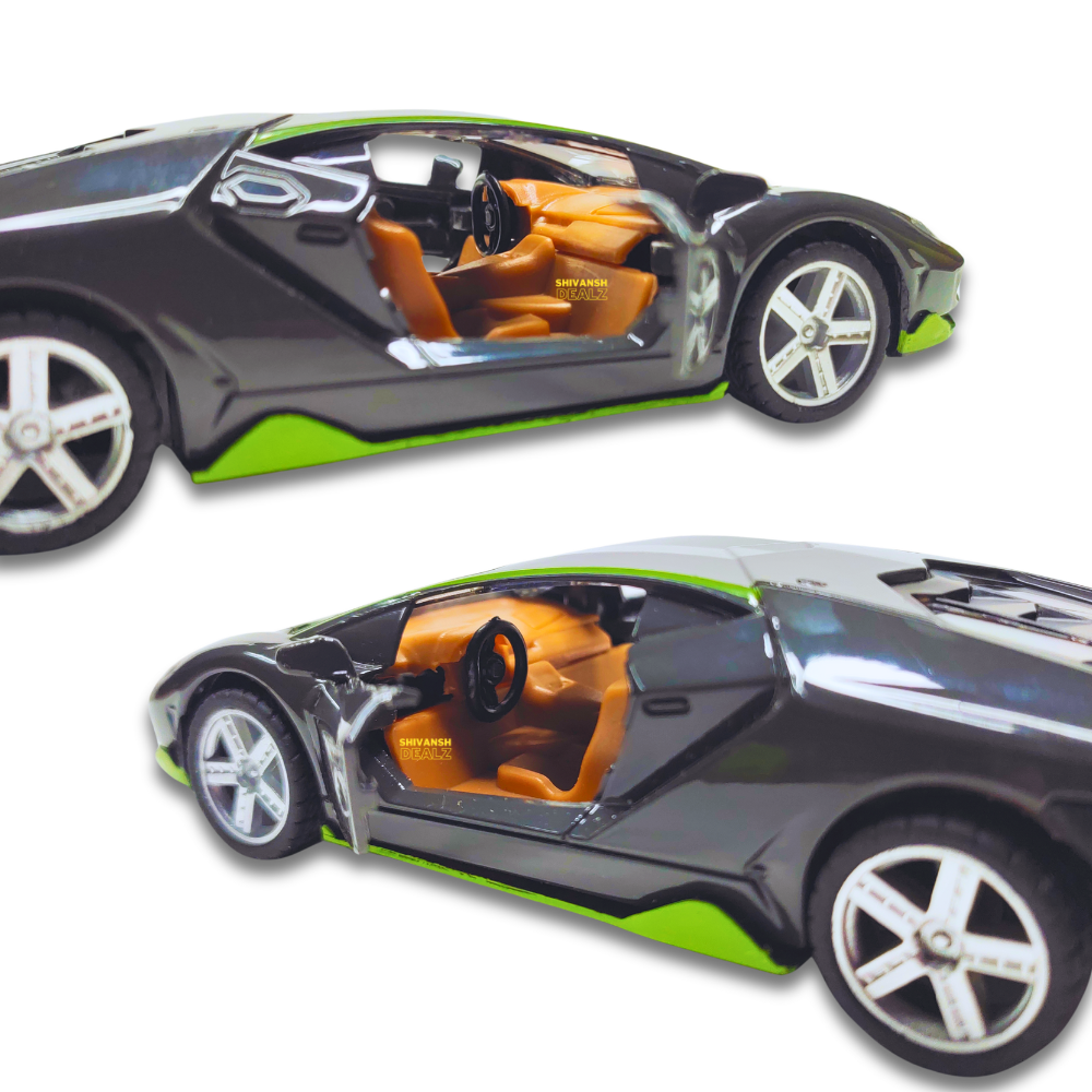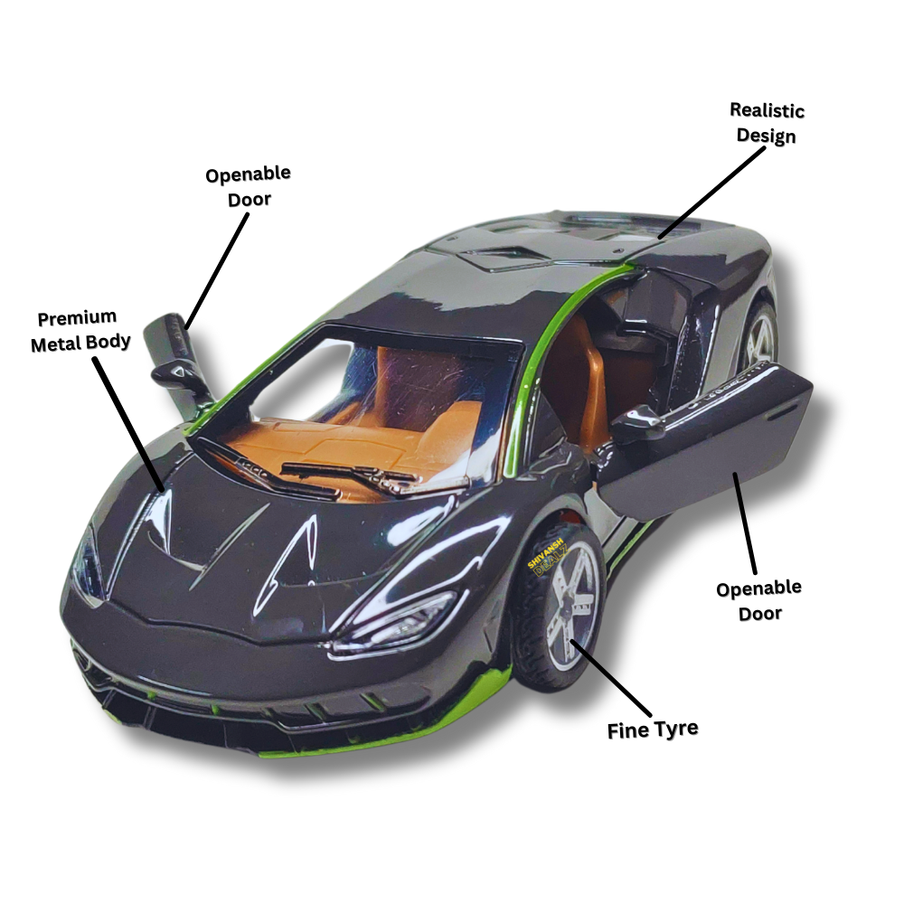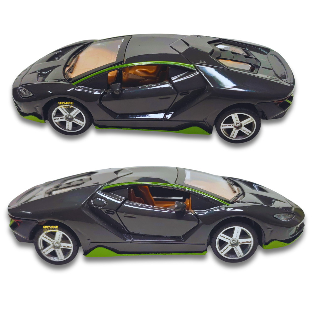 Stylish Lamborghini sports car toy by Shivansh Dealz – features a strong metal body, openable doors, and pull-back mechanism. Available in vibrant colors.