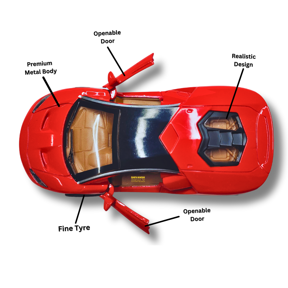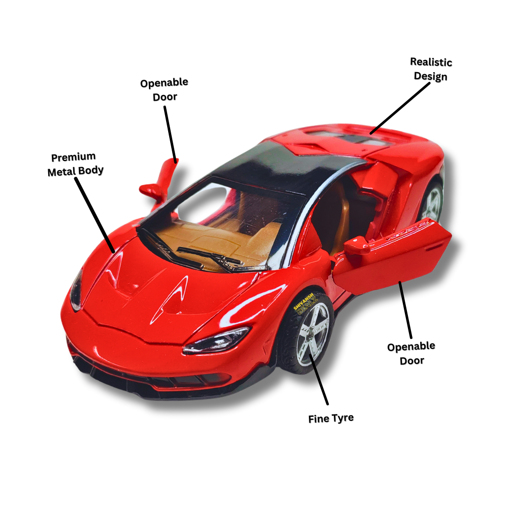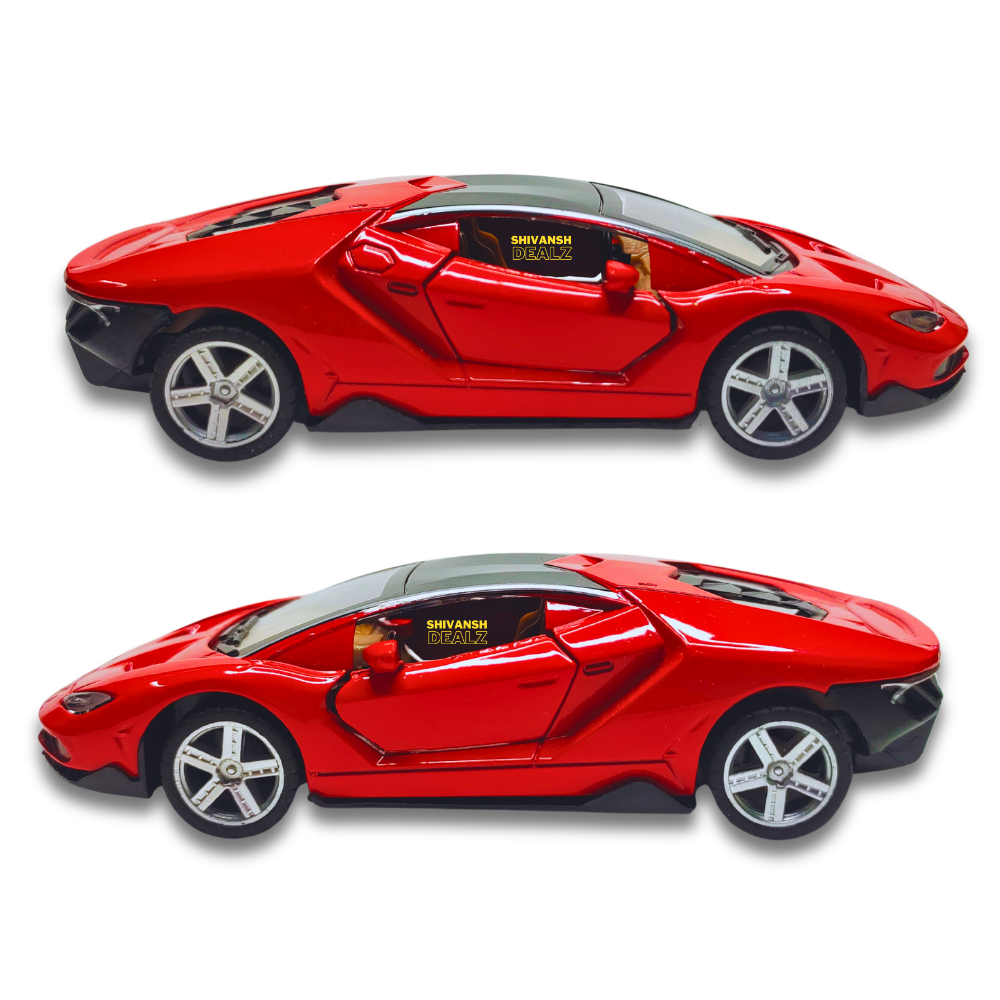 Stylish Lamborghini sports car toy by Shivansh Dealz – features a strong metal body, openable doors, and pull-back mechanism. Available in vibrant colors.