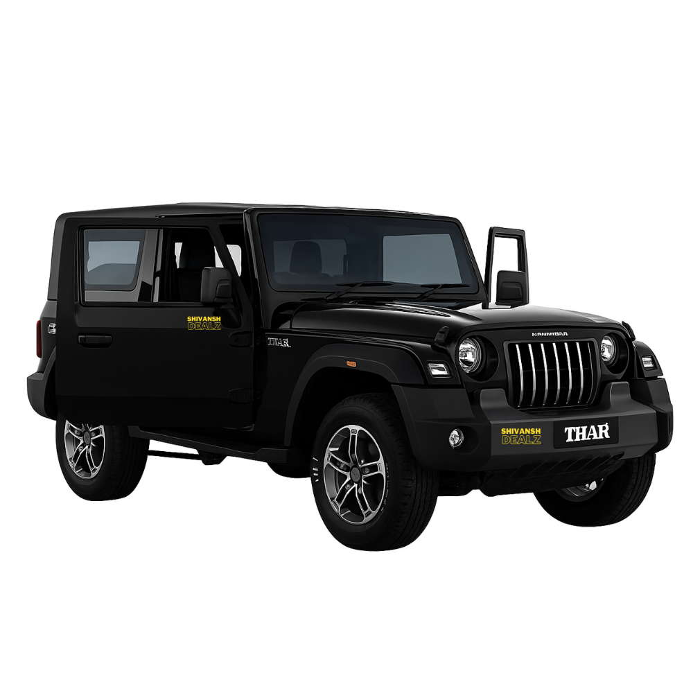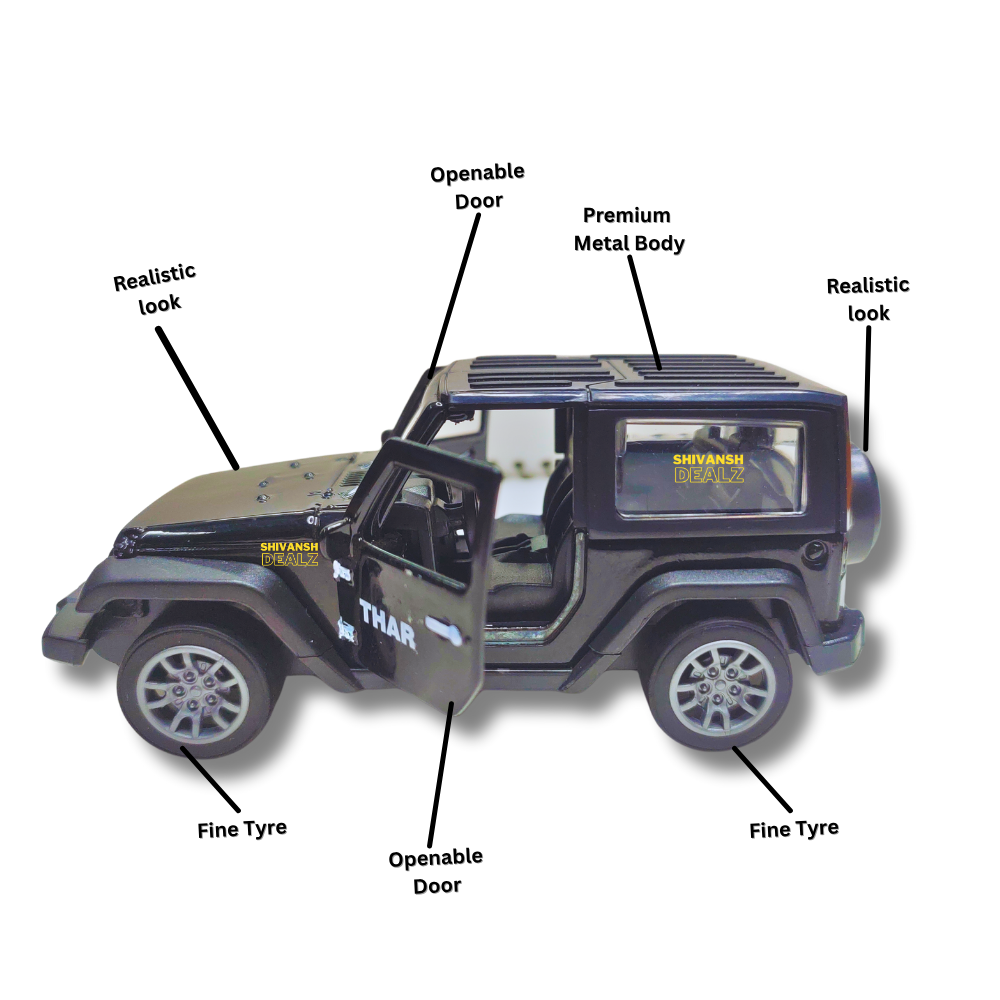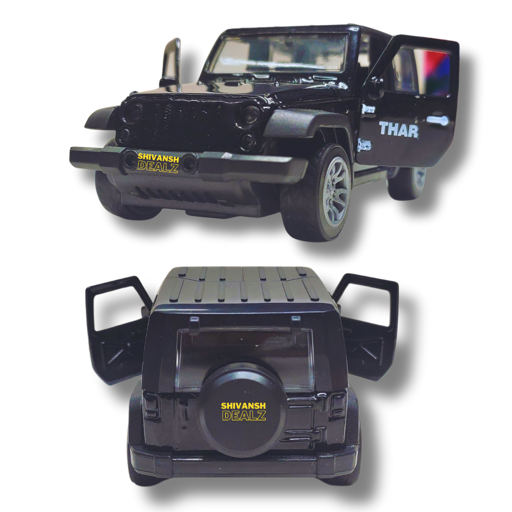 Rugged & stylish Mahindra Thar diecast SUV toy by Shivansh Dealz – crafted with a durable metal body, openable doors, and smooth pull-back action. Perfect for play or display.